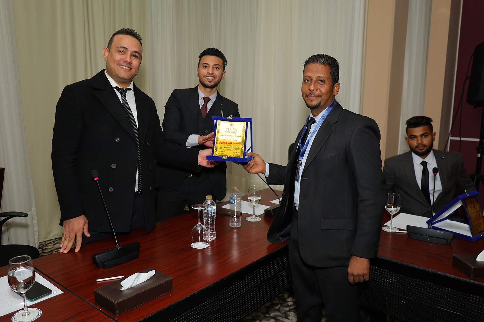 يظهر في الصورة تكريم الأستاذ حسام صبري خلال فعالية رسمية، حيث يتسلّم درع التقدير وسط أجواء احترافية تعكس قيمة المناسبة. الطاولة المستديرة، الميكروفونات، الكؤوس المرتبة بعناية… كل تفصيلة توحي بأن اللحظة لم تكن عابرة، بل محطة تقدير مستحقة.